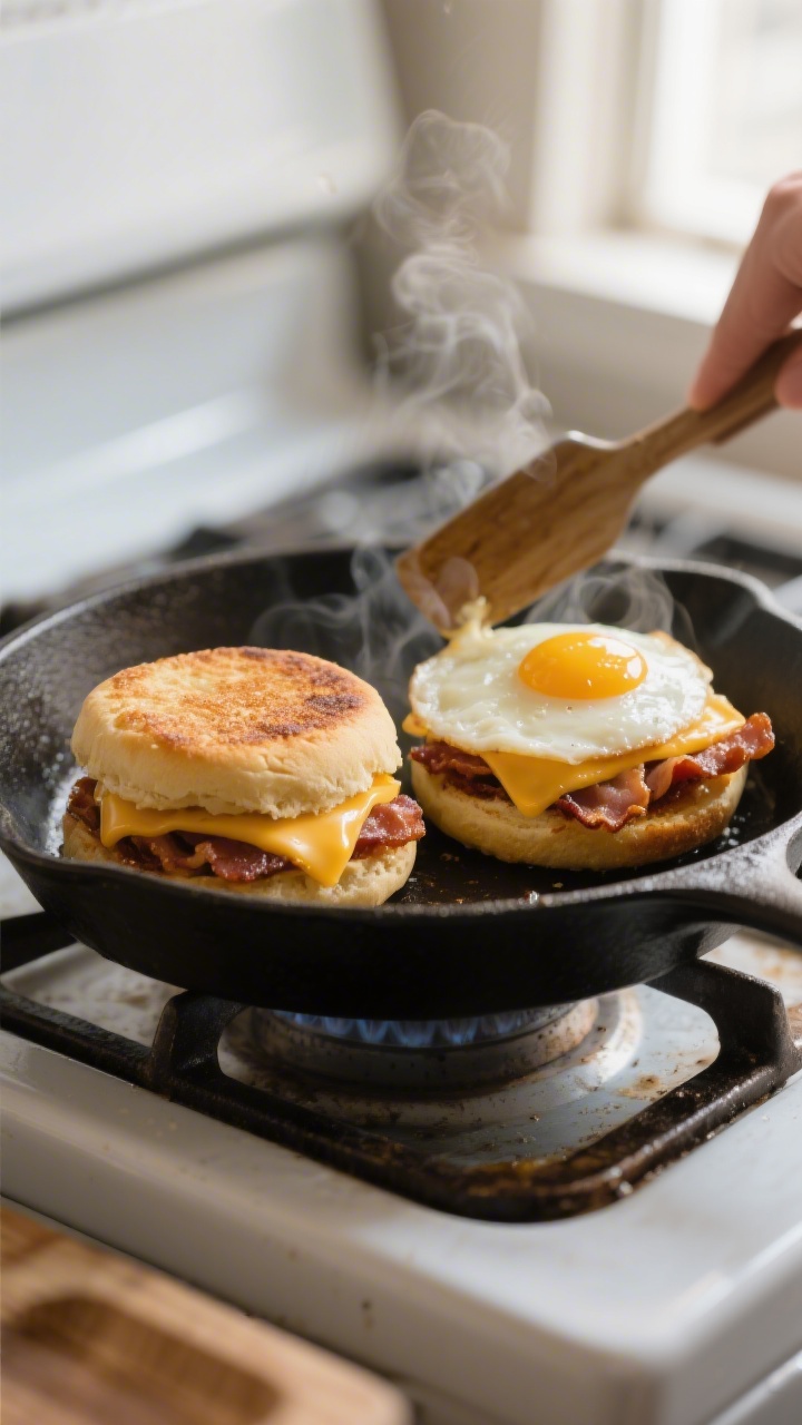 - Assemble. Layer the bottom muffin with protein, then the cheesy egg. Add any extras like spinach or hot sauce. Cap with the top muffin.
