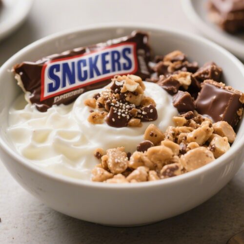 This recipe delivers classic “Snickers” vibes—peanuts, chocolate, and caramel—without the heavy sugar. It swaps ice cream for thick Greek yogurt and uses simple toppings to build that candy bar flavor profile.