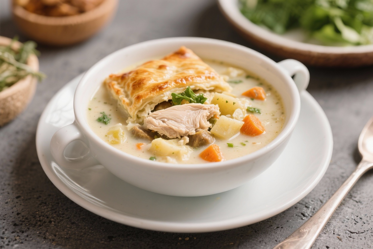 - Pot pie topping: Serve with buttery croutons or puff pastry squares baked separately for that pie feel.