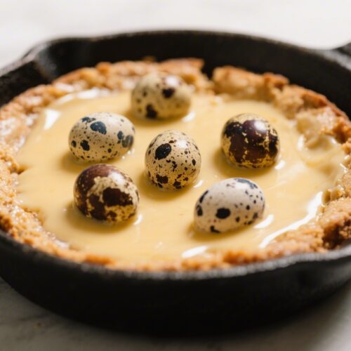 - Fill the skillet: Spread the batter evenly in the greased skillet. Press a few extra mini eggs on top for color and crunch.